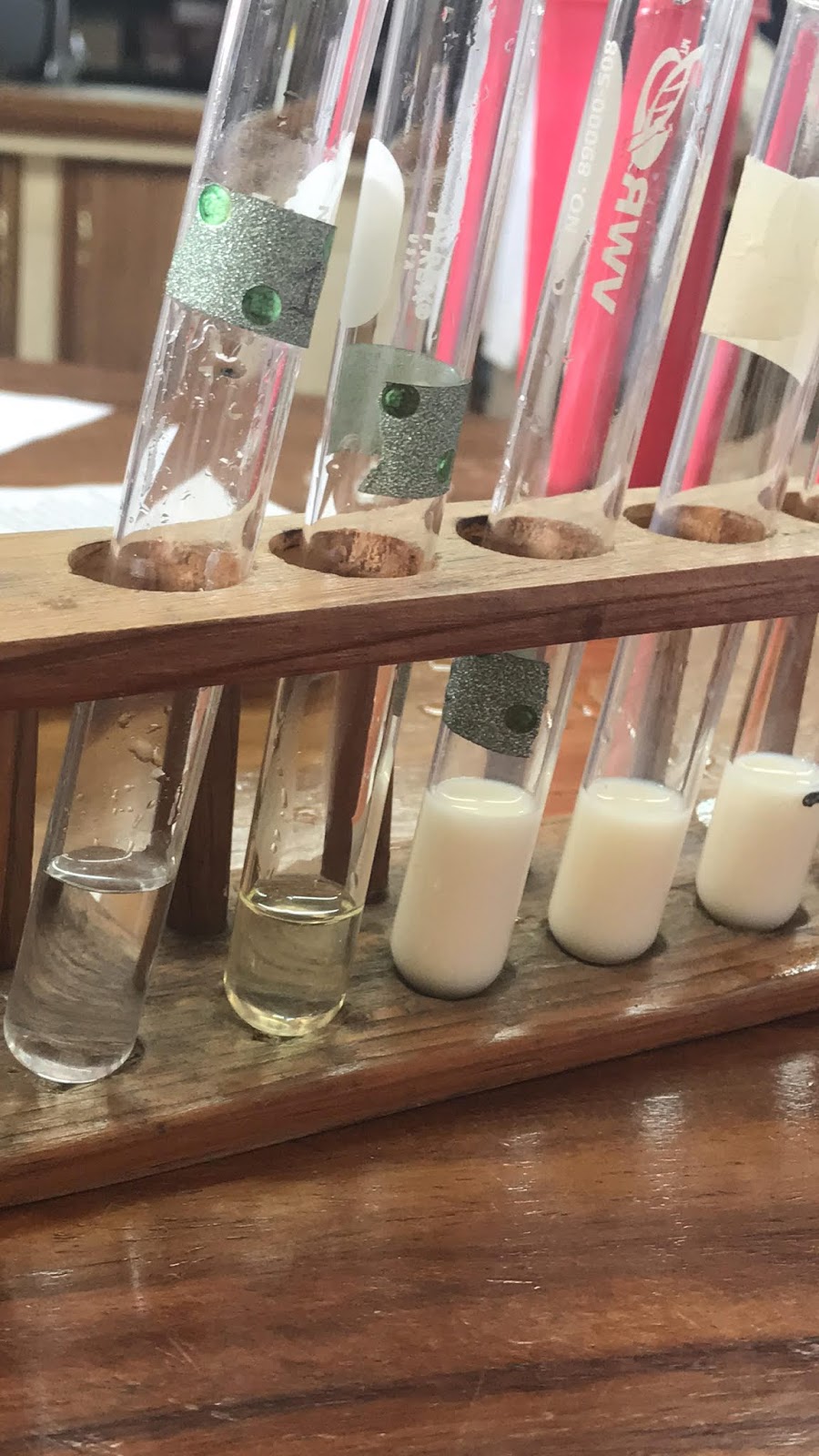 - El agua y la leche tiene la misma cantidad vertida en los tubos de ensayo.